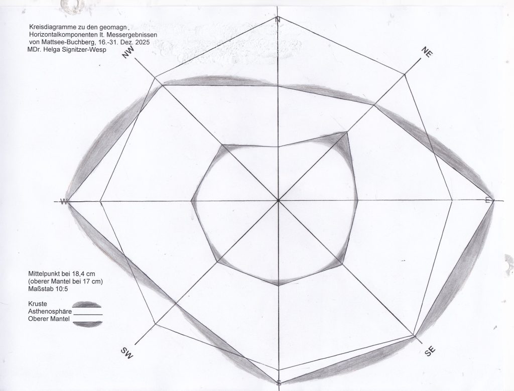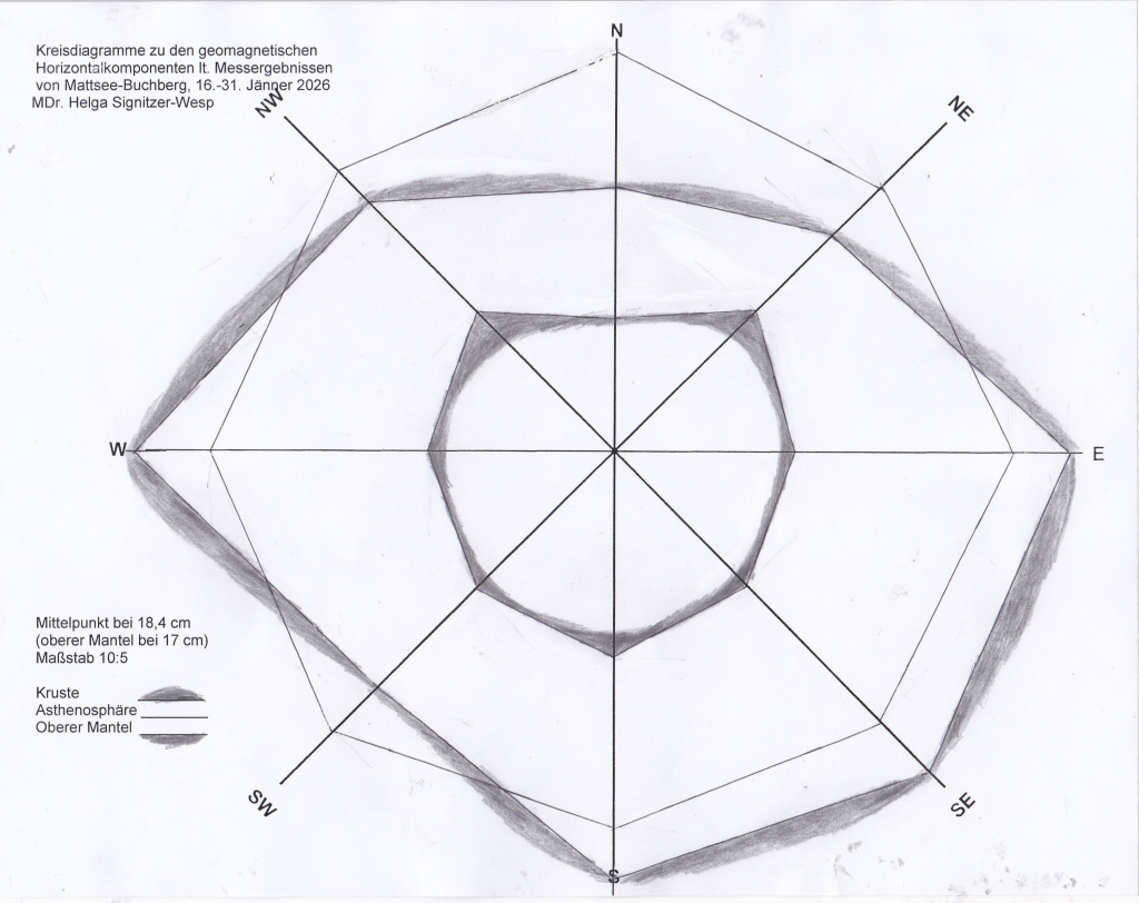 In der Erdkruste betragen Maximum/Minimum am 10./23. über acht Himmelsrichtungen 11,95/11,05 cm. Gleitphasen finden sich am 01./02. bei 11,25 cm und am 16./17. bei 11,45 cm.